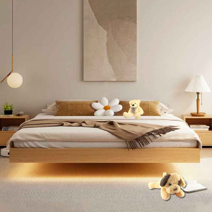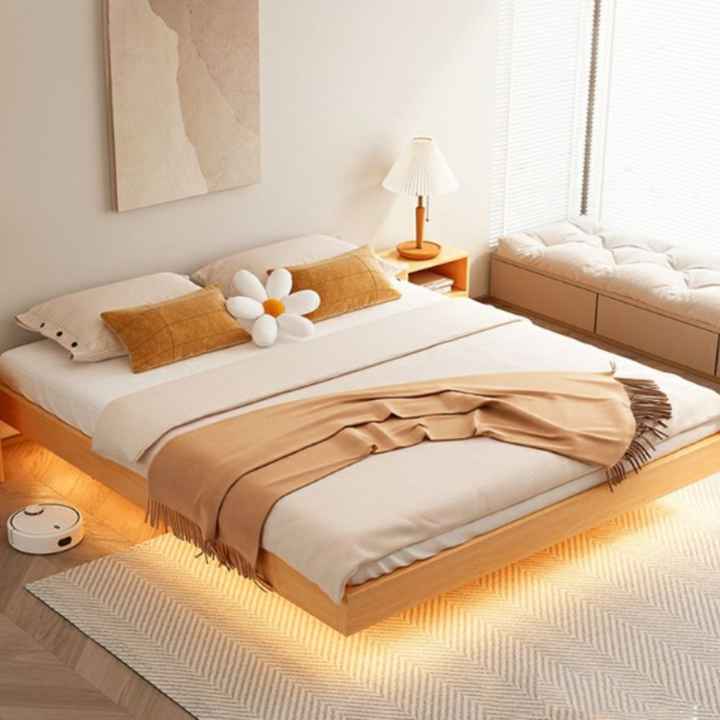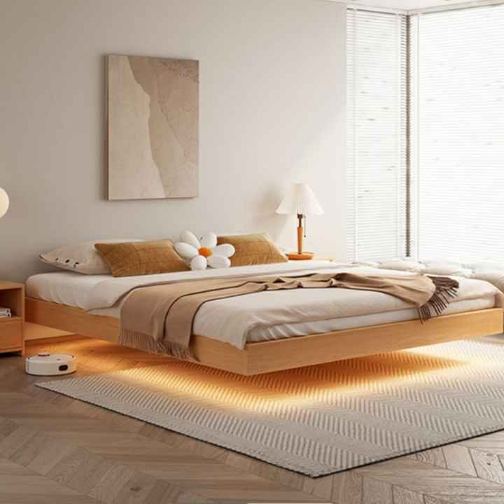سرير خشبي طبيعي بتصميم القاعدة المخفية يمنح الغرفة مظهرًا عصريًا وانسيابيًا، ويضيف لمسة من الأناقة والدفء للمساحة. يجمع بين البساطة في التصميم والابتكار في التفاصيل، ليكون الخيار المثالي لعشاق الذوق الهادئ والراقي.