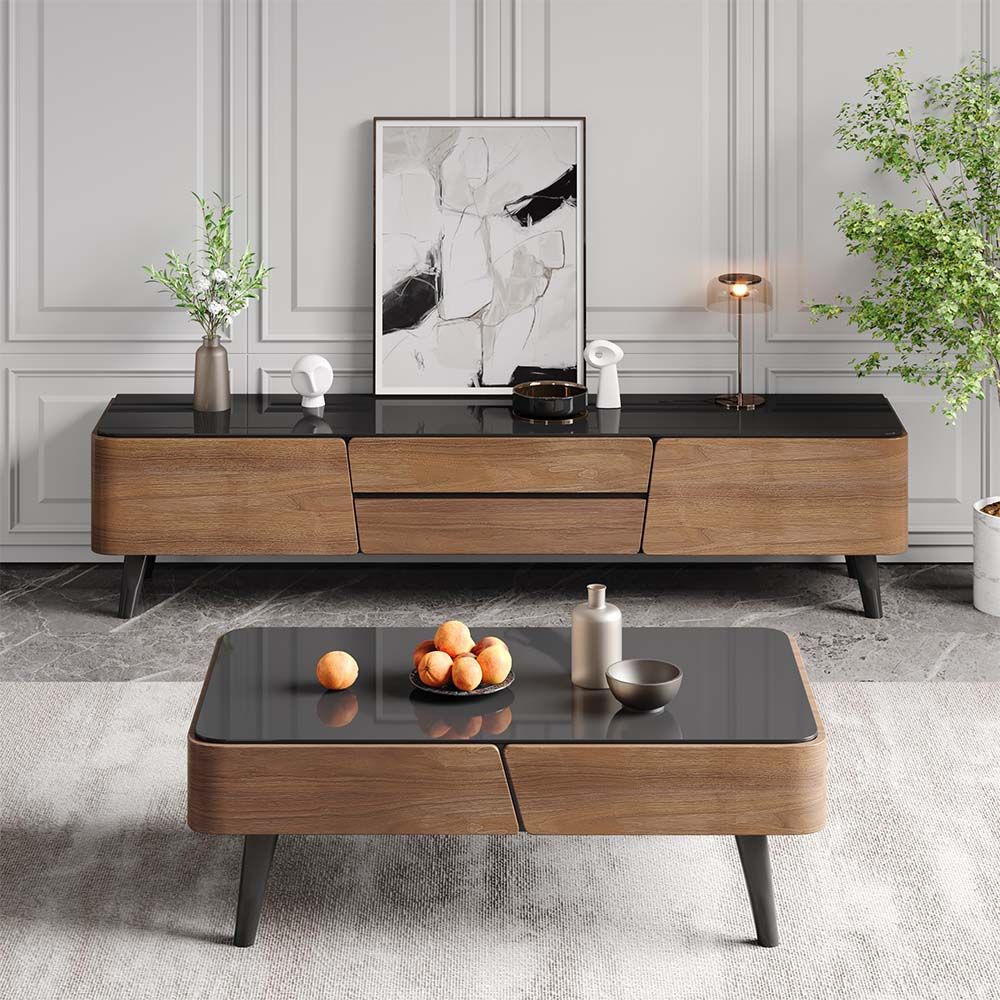 استمتع بتصميم عصري يجمع بين الأناقة والفخامة مع طاولة التلفاز والقهوة المودرن، المصنوعة من الخشب الطبيعي والخشب البديل للرخام. يتميز السطح الرخامي الأسود بمظهره الراقي، بينما تضفي الأرجل السوداء لمسة من التناسق الفريد، مما يجعلها إضافة مثالية لأي مساحة معيشة.