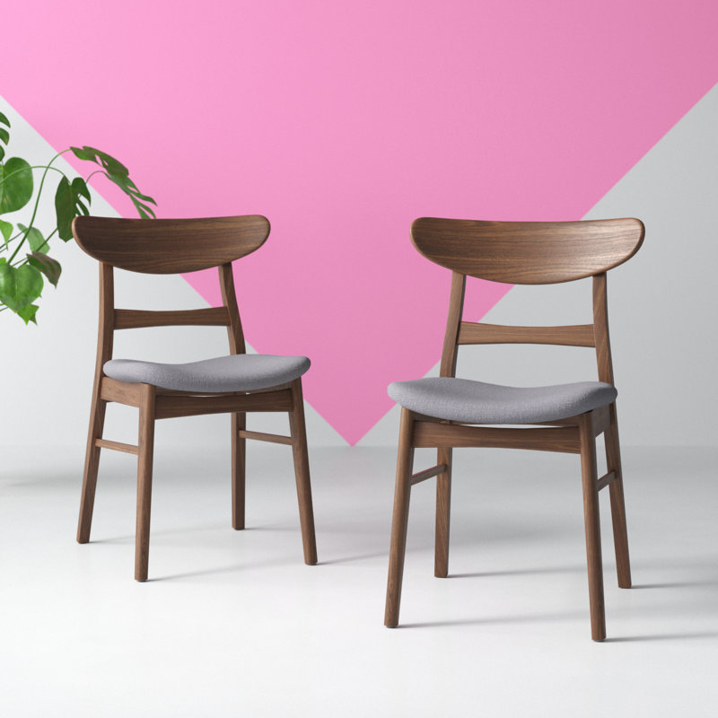 كراسي سفرة بتصميم ميد-سينشري، بظهر منحني مريح وأرجل مائلة تمنحها شكل مميز. مصنوعة من خشب الزان الطبيعي، ومبطنة بقماش رمادي أنيق لمظهر عصري وراحة تدوم.